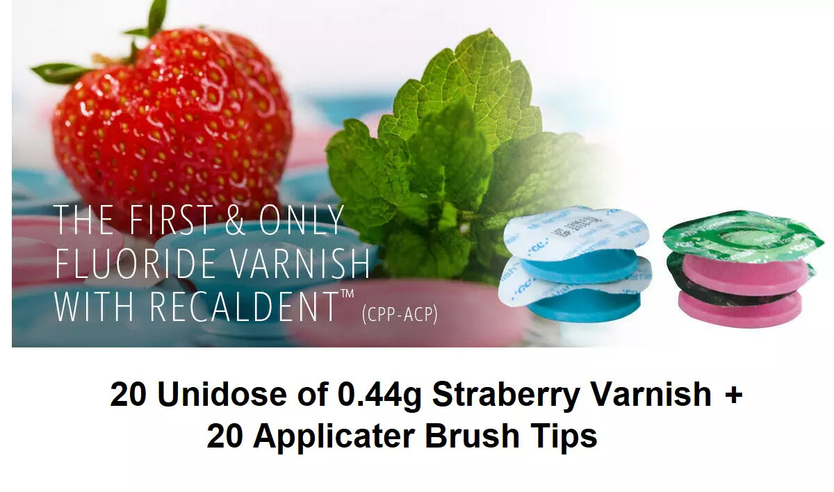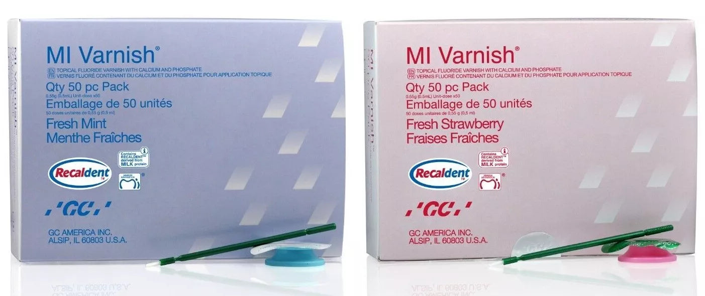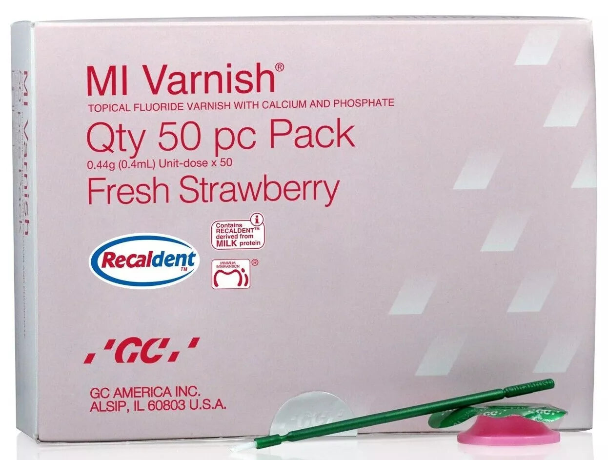 MI Varnish is a bioavailable varnish treatment that contains calcium, phosphate and fluoride. This product remains on the teeth longer than other fluoride varnishes and contains high levels of fluoride and calcium released in the oral cavity. The difference is in the RECALDENT™ (CPP-ACP), which makes MI Varnish a natural and unique choice for your patients. Casein phosphopeptides (CPP) naturally occurs in milk casein; Amorphous Calcium Phosphate (ACP), which is found in the RECALDENT™, is also the source of calcium and phosphate. In the oral cavity, CPP binds to oral surfaces such as teeth, dentin, oral mucosa and biofilm. Calcium and phosphate ions are the building blocks for healthy teeth and MI Varnish delivers bioavailable calcium and phosphate ions into the saliva.