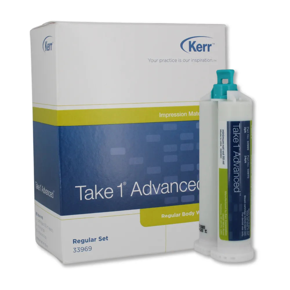 Take 1 Advanced vinylpolysiloxane (VPS) impression material employs Kerr's long history of expertise in developing high-performance impression materials, along with recent technological advancements, to deliver a VPS impression material with the optimum combination of physical properties: strength, elasticity, dimensional stability, and the ability to register detail in any environment. Furthermore, Take 1 Advanced comes in the widest selection of set times, delivery systems, and consistencies available on the market today - so you always have the perfect combination of mechanical properties in a material that feels like it was designed just for your technique preferences.