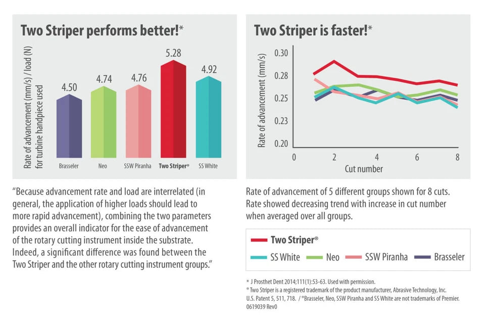 Always the Diamond Standard, Two Striper® stays sharp longer and delivers faster, cooler cutting than electroplated brands. Which means fewer burs, less chair time and happier patients. Made from a select grade of natural diamonds, only Two Striper burs are developed with a proprietary P.B.S.® brazing process that is recognized as the best bonding system in the industry. You can count on Two Striper® for efficient, predictable results.