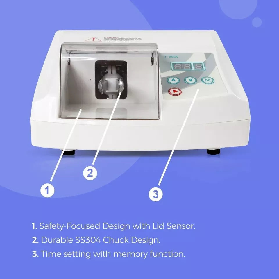 With a primary focus on achieving accurate and consistent mixing, the I-MIX Amalgamator ensures that dental restorative materials are thoroughly blended. This results in precise amalgamation that is crucial for optimal dental procedures, ensuring the best possible outcomes for patients. A standout safety feature is the built-in security system that immediately halts the motor when the safety lid is opened. This innovative design prevents accidents, prioritizing the well-being of both the user and the device.