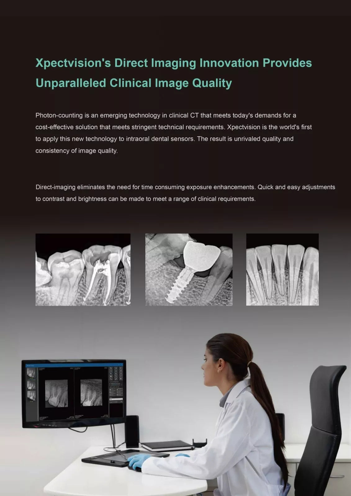 Photon-counting is an emerging technology in clinical CT that meets today's demands for a cost-effective solution that meets stringent technical requirements. Xpectvision is the world's first to apply this new technology to intraoral dental sensors. The result is unrivaled quality and consistency of image quality.