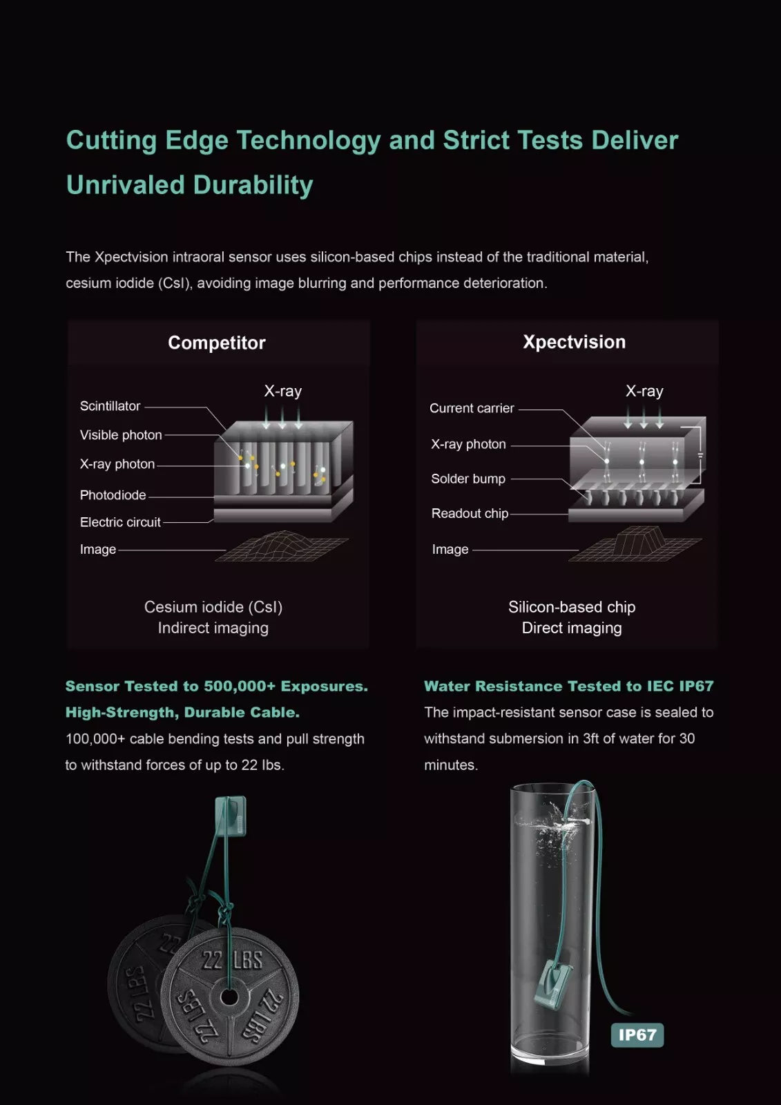 The Xpectvision intraoral sensor uses silica-based chips instead of the traditional material,cesium iodide (CsI), avoiding image blurring and performance deterioration.