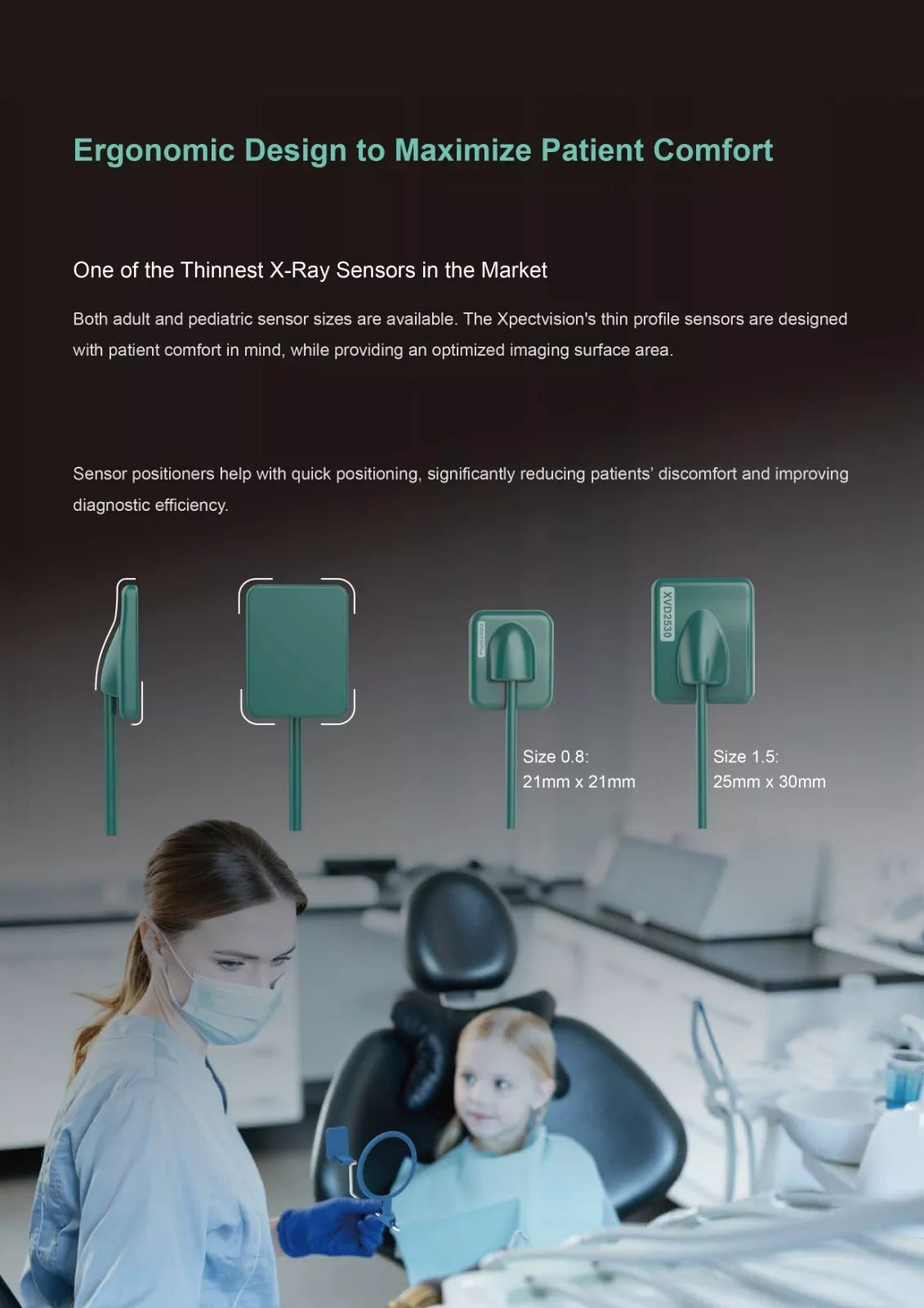 Both adult and pediatric sensor sizes are available. The Xpectvision's thin profile sensors are designed with patient comfort in mind, while providing an optimized imaging surface area.